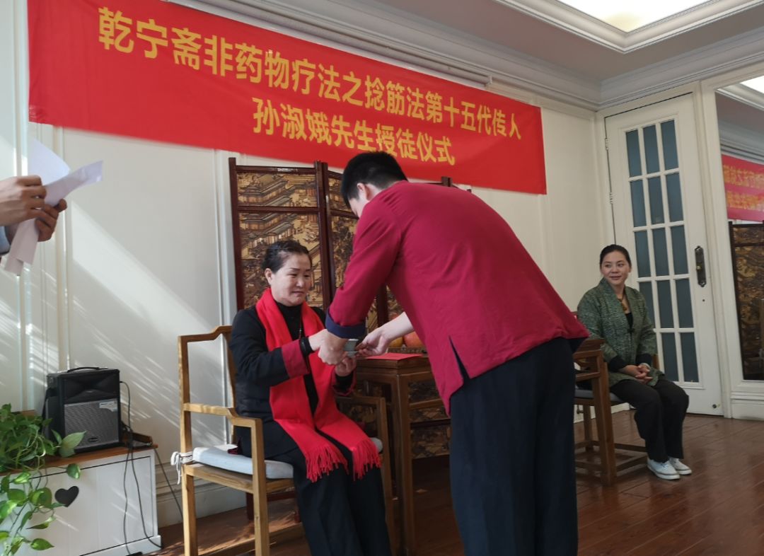 为继承和发扬中医文化这一优良传统,2018年10月26日上午,在乾宁斋国医馆举行了乾宁斋非药物疗法之捻筋法第十五代传人孙淑娥老师授徒仪式,共有六位弟子拜入孙淑娥老师门下。